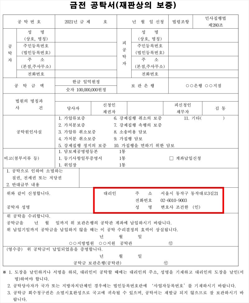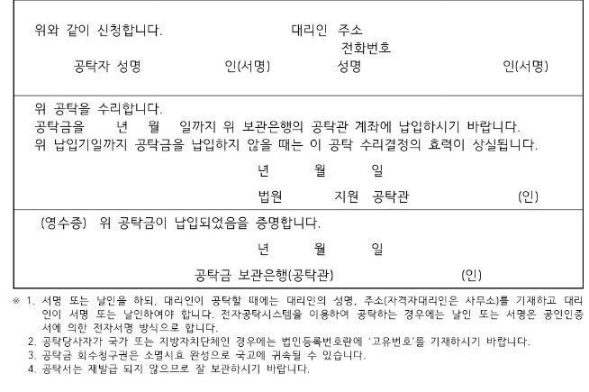 이렇게 공탁만 완료하고 끝났다고 가만히 계시면 안 됩니다.강제집행정지결정문 하단에 보시면 이 결정문을 집행기관에 제출하라고 되어 있습니다.우리는 이 결정문과 공탁서 사본을 경매계에 제출하면 된다고 합니다.그러면 경매는 일시 정지되고 본안 소송이 진행됩니다.* 추신 (22.11.23) : 위 사안은 공정증서에 의한 강제집행을 정지하기 위한 사건입니다.또 다른 사안은 주로 이 경우입니다. 어떤 경우냐면 1심 판결에 가집행 선고가 붙었을 때 이에 대한 강제집행을 정지하기 위해 공탁하는 경우인데, 이 경우 법령 조항은 민사소송법 제500조와 민사소송법 제501조입니다. 법령 조항을 모르면 더듬을 필요는 없어요. 틀리면 올바른 법령 조항을 알려주면서 수정하라고 보정이 나옵니다. 위 내용이 도움이 되었다면 공감버튼 눌러주세요~