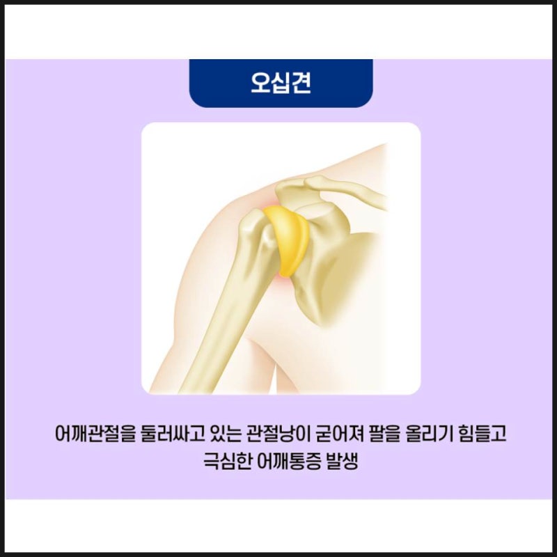 오십견은 ‘어깨주위염’이라고도 하는데, 어깨 관절을 덮고 있는 관절낭이 마치 어깨가 얼어붙은 것처럼 뻣뻣해져서 팔을 들 수 없게 되는 것입니다. “유착성 관절낭염”입니다. 어깨 주위에 통증이 발생하여 어깨 관절을 사용하기 어려워지고 몇 주 후에 심각한 운동 장애가 발생할 수 있습니다. 40대에게도 발생할 수 있습니다. 또한 남성 환자보다 여성 환자가 더 많습니다. 실제 의료 빅데이터에서는 2021년 오십견에서 진찰을 받을 환자 중 여성 환자는 약 51만 명, 남성 환자는 약 36만 명으로 여성 환자가 남성 환자의 약 1.4배다.