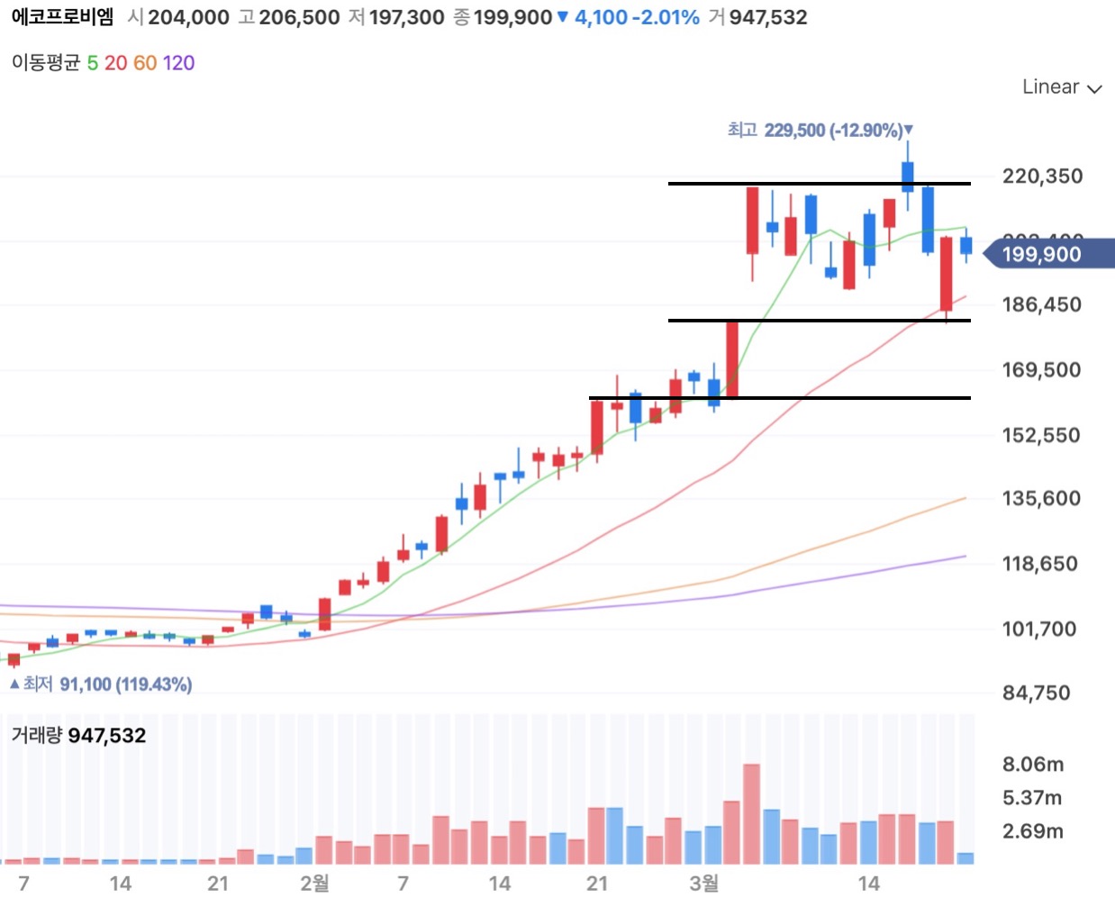 최근 뜨거워진 두 번째 배터리 언더 이벤트 코스닥 시가총액 1위인 에코프로비엠의 현재 주가와 향후 추이를 살펴보자.