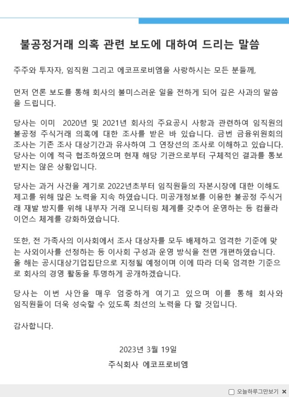 에코프로비엠 “불공정 거래 신고”에 대한 공식입장