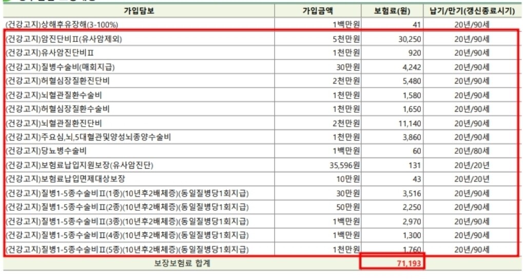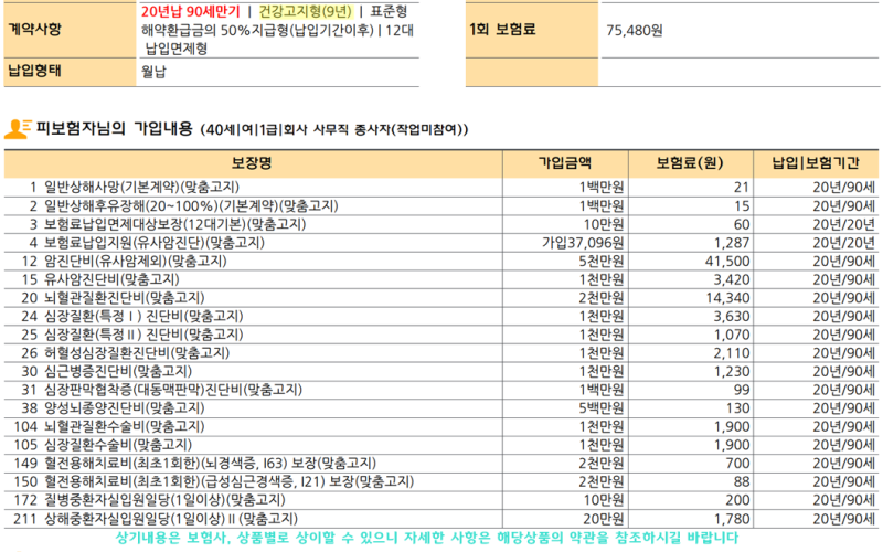여성의 경우 A~D사의 보험료를 비교했을 때, B사가 가장 합리적인 것으로 나왔습니다. B사의 건강보험으로 설정하면 월 42,871원으로 자사 일반검진형보다 36% 저렴하게 준비할 수 있습니다. 위 4곳 외에 다른 곳까지 포함하면 월 3만원 이상 차이가 날 수 있으니 적지 않은 금액이죠? 그럼 B사의 여성 설계안을 살펴보겠습니다. 여성의 경우, 제가 알려드릴 B사의 독특한 특징이 있습니다. 마찬가지로 암의 경우 신체부위별로 보장받을 수 있는 통합암진단비로 설정되어 있습니다. 아래 박스로 표시된 부분을 보시면 추가 비용 없이 포함되는 추가 정보를 확인하실 수 있습니다! *출산 후 1년 보험료 면제 서비스* 항암 및 수술 보장 가입 시) 자궁이나 난소의 특정 질환인 암 진단을 받고 난자 동결 보존 수술을 받은 경우 보험금의 50%를 선불로 지급합니다.두 번째는 특별계약을 가입한 후 특정 질환으로 진단을 받아야 하지만 출산의 경우 1년간 월 보험료를 내지 않아도 되므로 여성에게는 추가 혜택입니다!건강보험 유형으로 할인을 받고 출산 후 1년간 보험료 면제 서비스까지 받으면 다른 플랜으로 준비하는 것보다 총 지불해야 할 비용이 줄어들어 합리적으로 준비할 수 있습니다!오늘의 글에서는 일반 검진 기준을 기준으로 설명드렸지만 단순 검진의 경우에도 건강보험 플랜으로 할인을 받으실 수 있습니다. 보험은 한두번 내고 끝인 것이 아니라, 납입기간 설정에 따라 최소 10년, 20년, 30년 동안 매달 내야 하는 것입니다. 같은 혜택을 받는다면, 부담 없이 저축하고 유지할 수 있다면 좋지 않겠습니까? 제가 글에서 항상 안내해 드리는 곳 외에도 30곳이 넘는 곳을 비교 분석해 드리니, 제 관점에서 유리한 곳이 궁금하다면 부담 없이 1:1로 요청해 주세요!