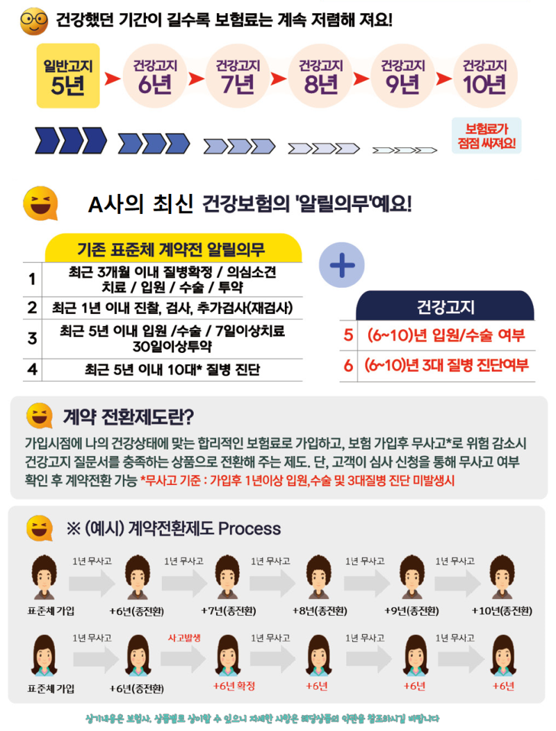 건강보험은 보험가입 시 회사에 알려야 하는 대표적 질문 3가지 외에도 최근 N년 이내의 입원 및 수술 이력을 추가로 체크하는 보험입니다. N년 이내에 입원 및 수술 이력이 없다면 기존 일반 검진 보험보다 월 납입 금액을 더 할인해주는 플랜입니다!