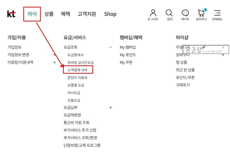 몇 가지 카테고리가 보이는데 저희가 사용하는 것은 마이페이지입니다. 이 안을 눌러보면 스마트폰을 사용하면서 알아야 할 다양한 정보들을 직접 확인할 수 있습니다. 예를 들어 내가 어떤 요금제를 사용하고 있는지, 금액 한도는 얼마나 남았는지, 그리고 곧장 내려오면 일반 정기 한도 변경을 쉽게 찾을 수 있을 것입니다.