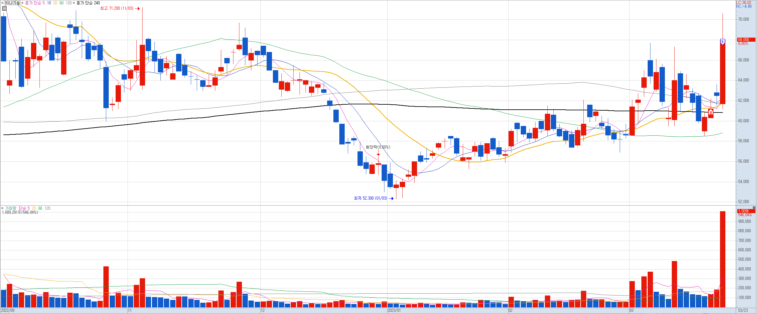 설명: 최근 240선 돌파 후 60선 지지시 240선 위로 회복하며 종가 진입. 어제는 검은색 막대로 마감했는데 고점보다 저점이 길어 반등의 여지를 보이는 것 같아서 오늘 하루 더 지켜봤습니다. 오늘 큰 폭의 상승을 기대하지는 않았지만 전고점인 67,500원에 모두 일찌감치 매도하고 다른 일을 하다가 장중 강한 상승에 서명했습니다. 급등은 예상보다 훨씬 큰 급등을 보여 오늘 마감됩니다. 오늘 수익 감사합니다. 매일 그만큼 벌 수 있으면 좋겠어요.